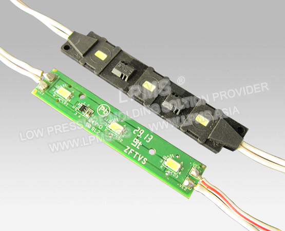 Low pressure molding is also widely used in LED lamp, LED string light, LED module and LED screen. Compare to conventional potting and high pressure molding, low pressure molding cycle time is short, productivity is higher, has no damage to components,and provides water-proof.